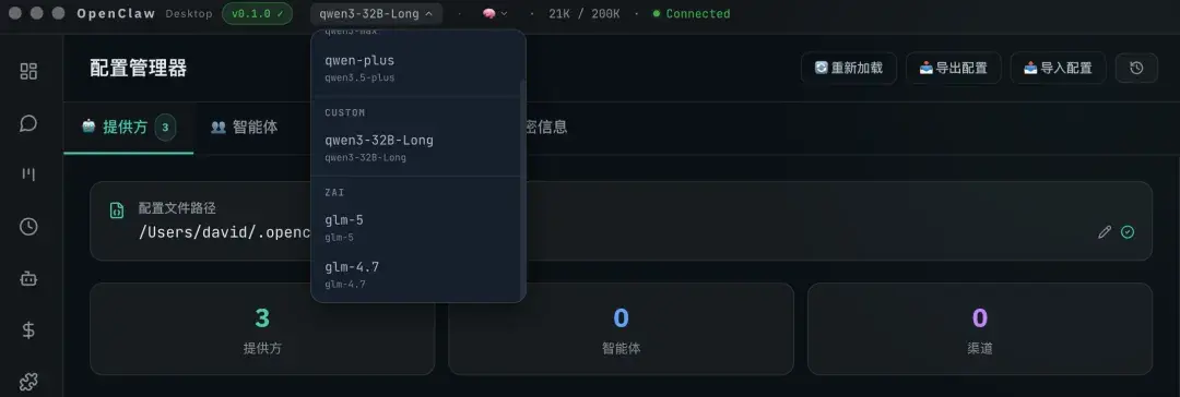 OpenClaw 桌面版目前支持接入国内常用的 LLM 提供方,例如:DeepSeek、Kimi、阿里云百炼 DashScope、智谱 BigModel GLM。