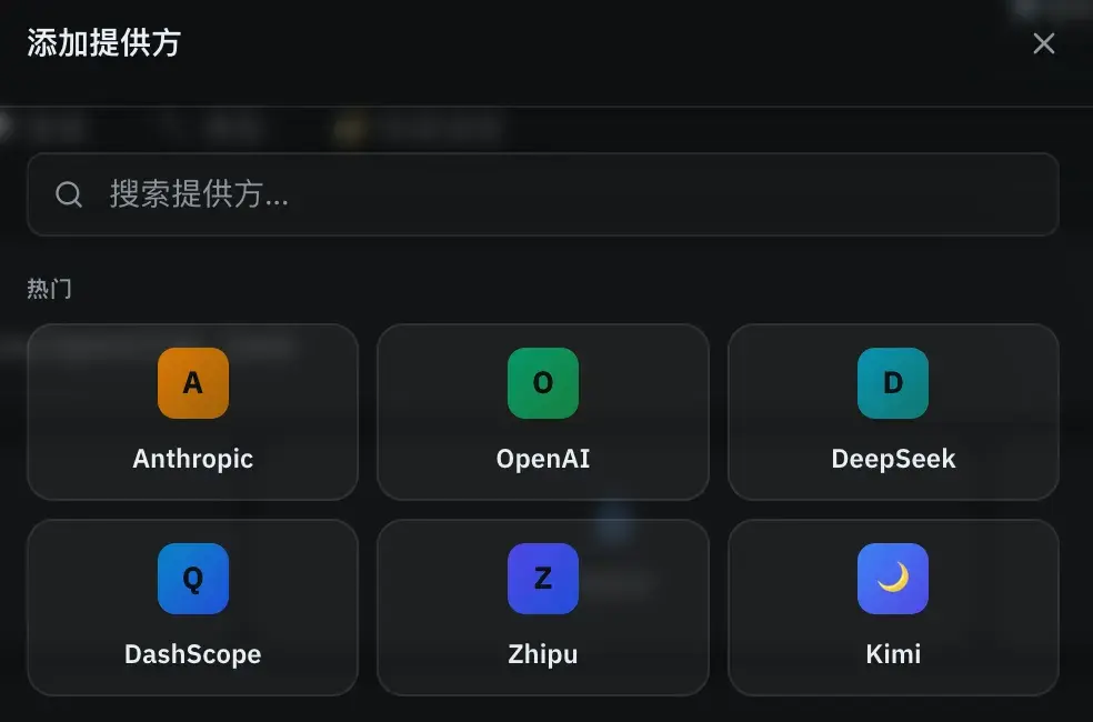 以智谱为例,点击“添加提供方”按钮,从“热门”中选择“Zhipu“。