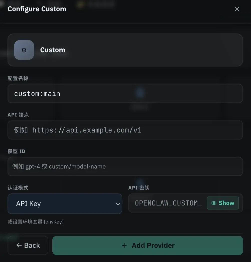 现在是你开始使用 OpenClaw 的关键一步:配置提供方(Provider),即 LLM 模型提供方。