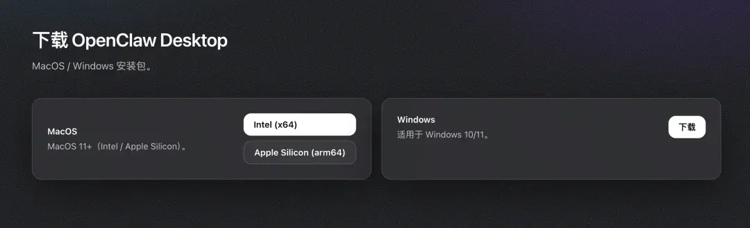 打开OpenClaw 桌面版官网,你会看到可以下载 Windows 版和MacOS版。