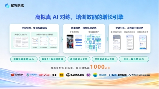 星火陪练专注于企业服务与培训场景,融合星火大模型及多项AI技术,通过高拟真的AI对练,助力员工提升专业服务水平,助力培训师提升课程开发效率。在比亚迪、新奥燃气、美团、新华保险等众多行业头部客户中,创造AI赋能企业培训的巨大价值,每年提供对练超1000万场。
