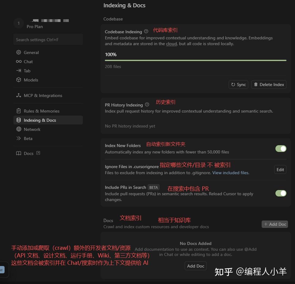 Codebase Indexing:把你的项目文件做语义化索引(生成embeddings),使得AI在语义搜索、回答问题或生成代码时能引用整个代码库的上下文。