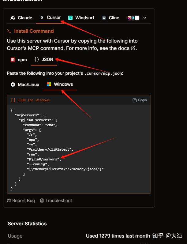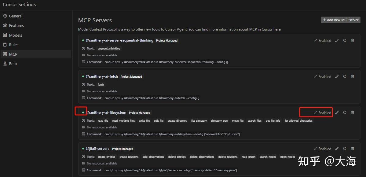 "mcpServers": { "@smithery-ai-server-sequential-thinking": { "command": "cmd", "args": [ "/c", "npx", "-y", "@smithery/cli@latest", "run", "@smithery-ai/server-sequential-thinking", "--config", "{}" ] }, "@smithery-ai-filesystem": { "command": "cmd", "args": [ "/c", "npx", "-y", "@smithery/cli@latest", "run", "@smithery-ai/filesystem", "--config", "{\"allowedDirs\":\"I:\\\\Cursor\"}" ] }, "@jlia0-servers": { "command": "cmd", "args": [ "/c", "npx", "-y", "@smithery/cli@latest", "run", "@jlia0/servers", "--config", "{\"memoryFilePath\":\"memory.json\"}" ] } }