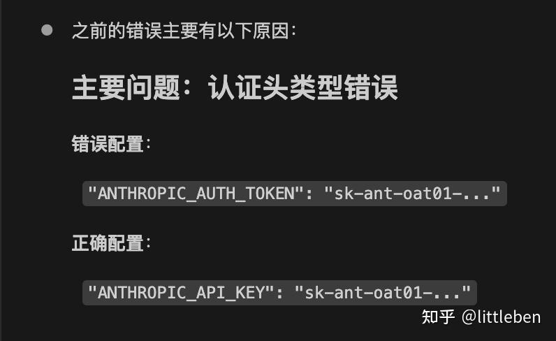 配置里,需要正确使用 ANTHROPIC_API_KEY 或 ANTHROPIC_AUTH_TOKEN,取决于你使用的服务商。