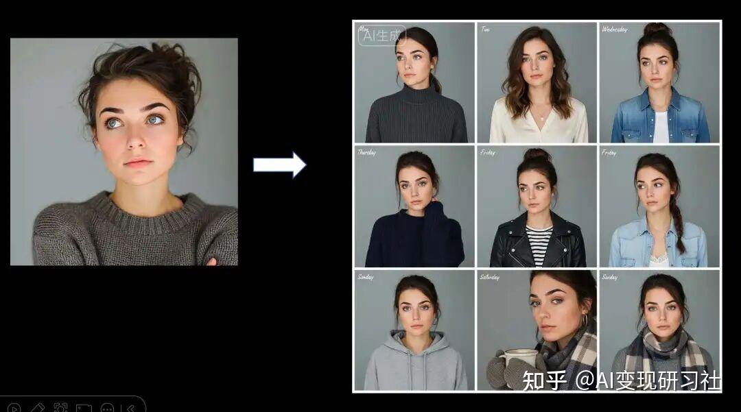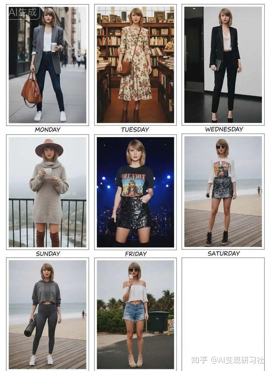 提示词:分析我的图片人物特点,为我生成一套一周七天的 OOTD 图片(穿搭)