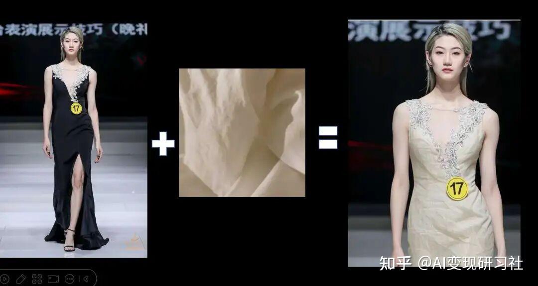 提示词:将图1中模特的衣服面料、颜色换成图2,其他不变