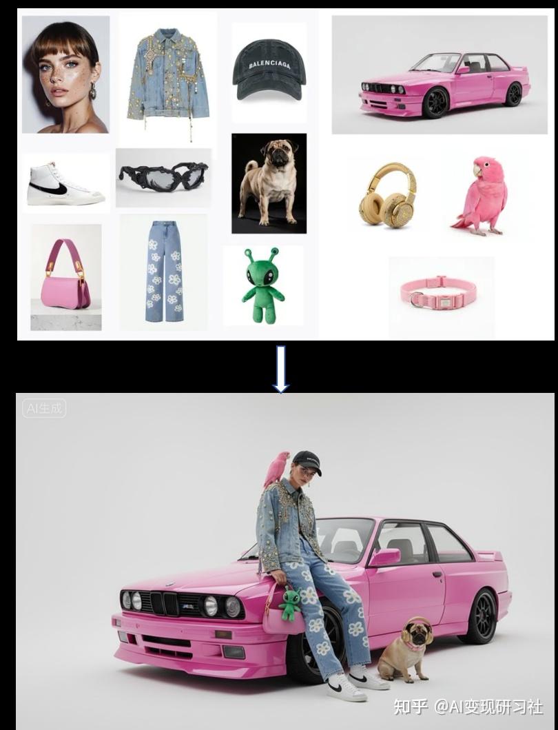 输入提示词:一位模特正倚靠着一辆粉色宝马摆姿势。她穿着以下物品,场景背景为浅灰色。那只绿色小外星人是钥匙扣,挂在粉色手提包上。模特肩上还停着一只粉色鹦鹉。她身旁蹲着一只哈巴狗,戴着粉色项圈和金色耳机。