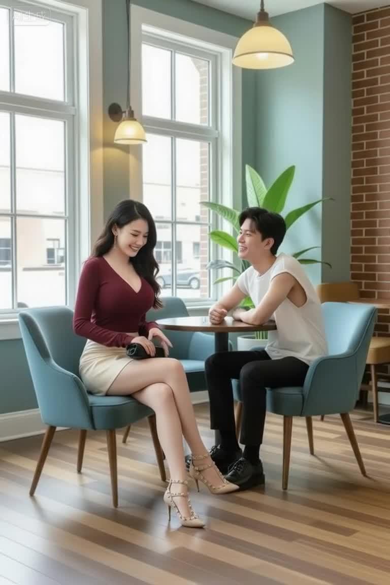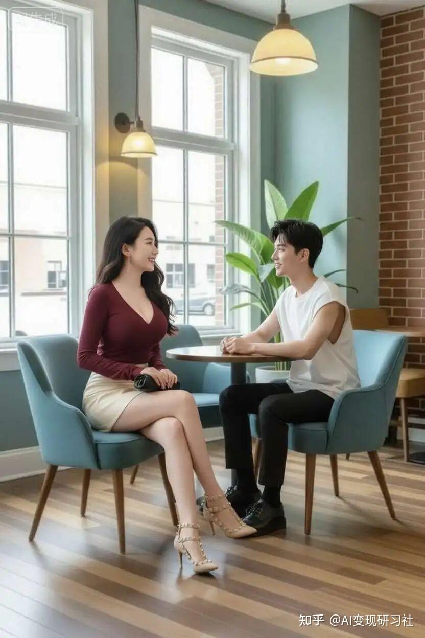 提示词:将图1中的女性和图2中的男性,分别坐在图3的紫色和红色框的椅子上,环境融合得极为真实,增强最终效果