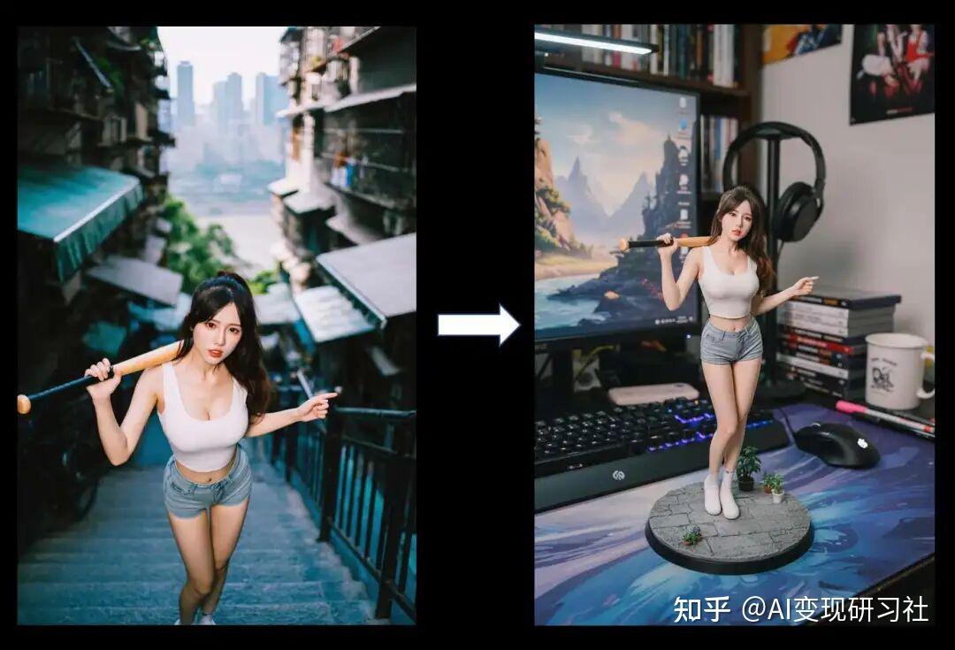 提示词:把图中的角色,1/7比例的商业化手办,写实风格,真实环境,手办放在电脑桌上,电脑屏幕里的内容为江景