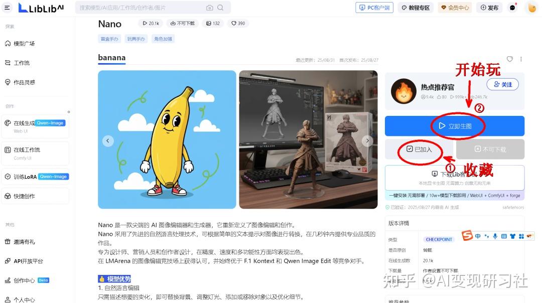 打开 Liblib 网站:www.liblib.art,首页搜索 “Nano”, 找到这个香蕉封面的模型