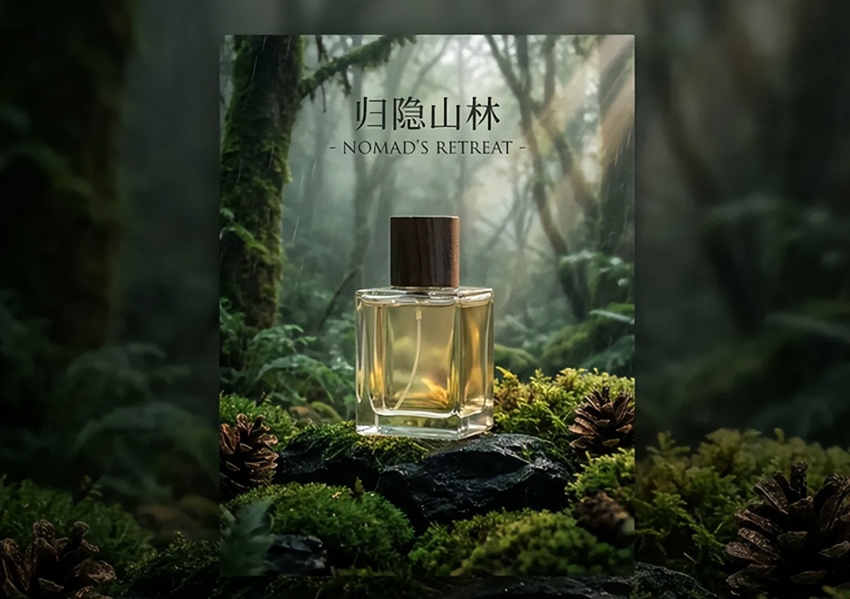 提示词:请为我生成一张电商海报视觉图,用来呈现一款高端的小众沙龙香水(极简方形透明玻璃瓶,深胡桃木瓶盖)。场景设定在雨后的深山古林,背景是湿润的深绿色植被,模拟清晨透过树叶缝隙洒下的“丁达尔光效”(耶稣光),冷暖对比微妙,整体色调偏向墨绿与深灰,呈现静谧的高级质感。产品平稳放置在一块覆盖着湿润青苔的黑色不规则岩石上,强调产品与自然的共生,苔藓的绒毛感清晰可见,显得生机勃勃,香水瓶身玻璃通透,内部淡金色液体在光线下折射出琥珀般的光泽,岩石边散落着几颗带露水的松果,远景是层层叠叠的古树树干+缭绕的白色晨雾,深度虚化背景,整体视觉突出品牌“归隐山林”的禅意与克制的奢华感。