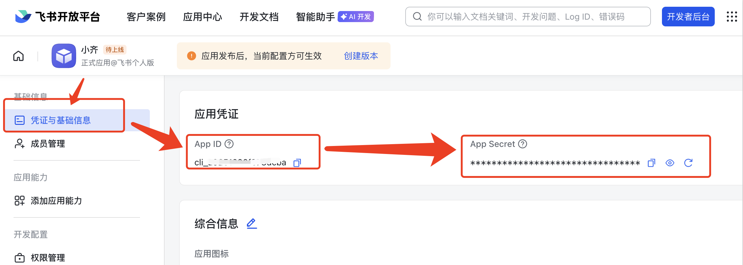 - 找到 App ID 和 App Secret,复制出来,备用