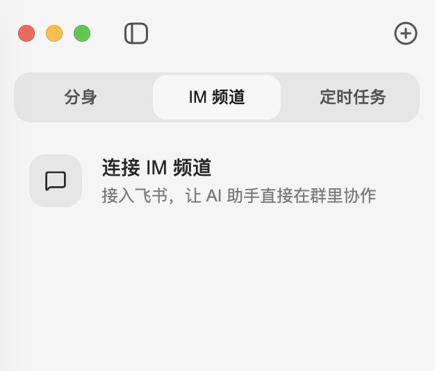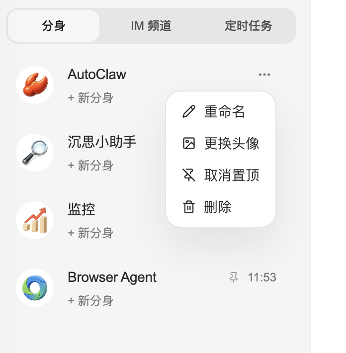 左侧对话列表,上方三个模块:分身、IM频道,定时任务,下方是头像设置和偏好设置