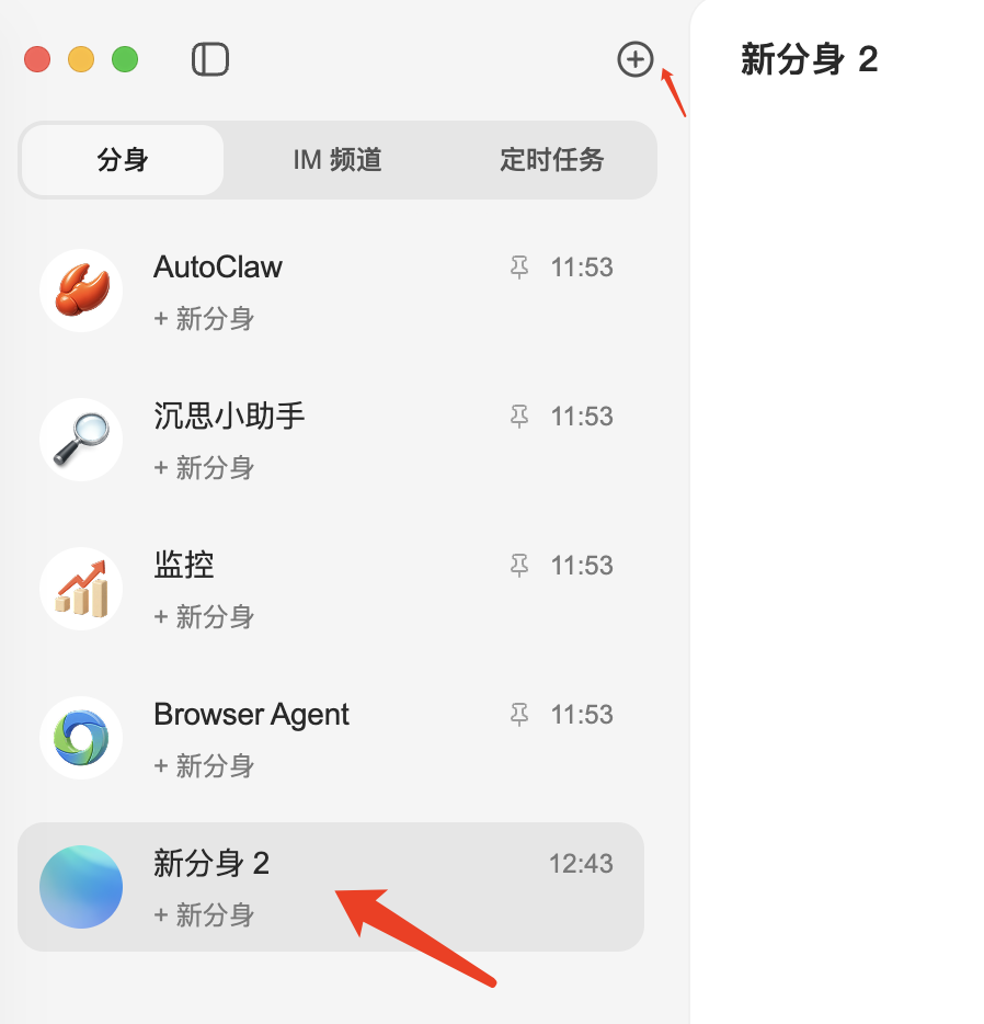 点击右上角的“+”号,可以创建新的分身