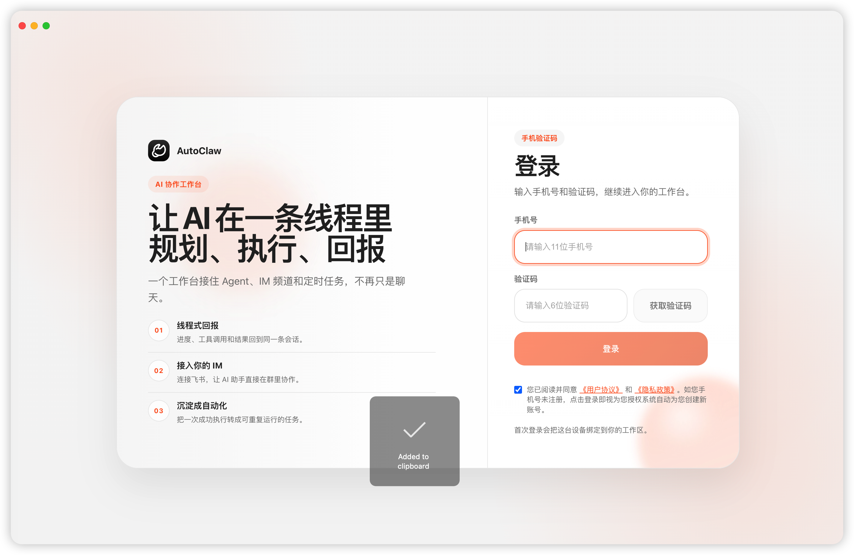 目前 AutoClaw 刚刚发布,主要支持客户端及版本范围:win10 + /macos 11 +(仅支持苹果芯片,不支持intel芯片);