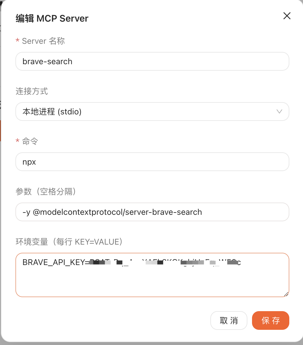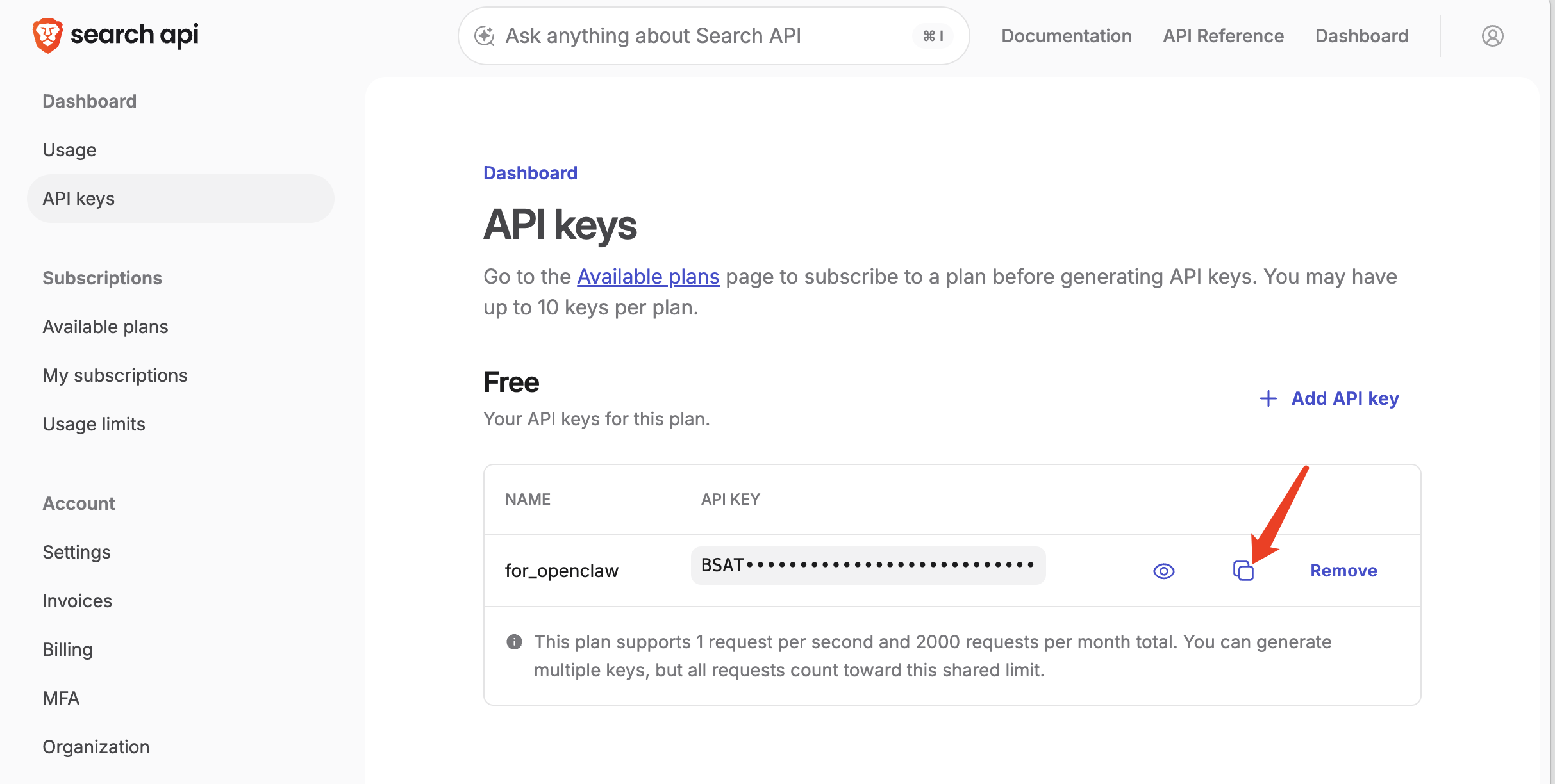获取你的 brave search API key: https://api-dashboard.search.brave.com/app/keys