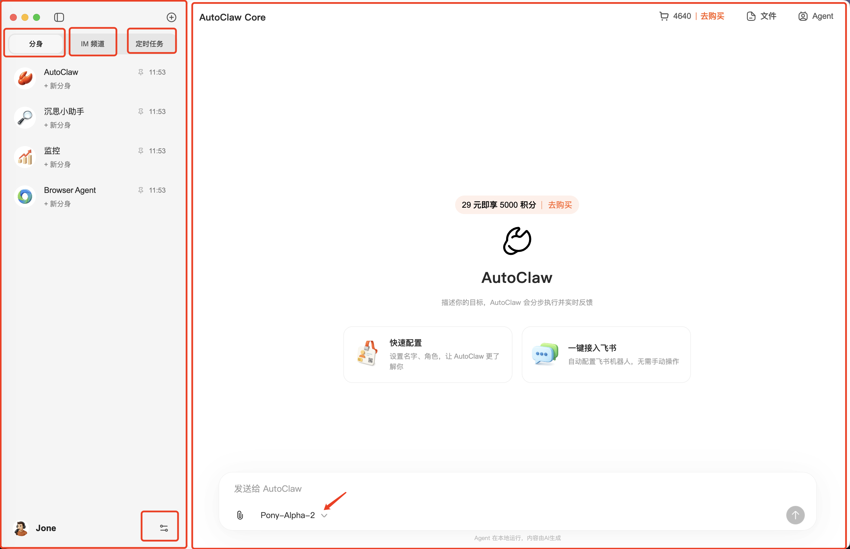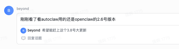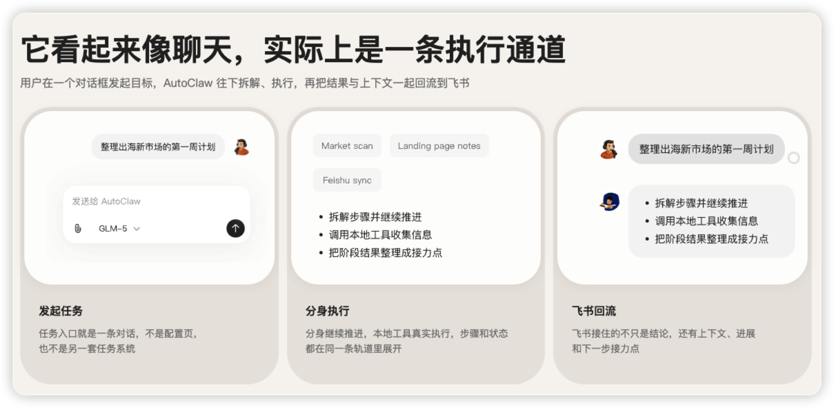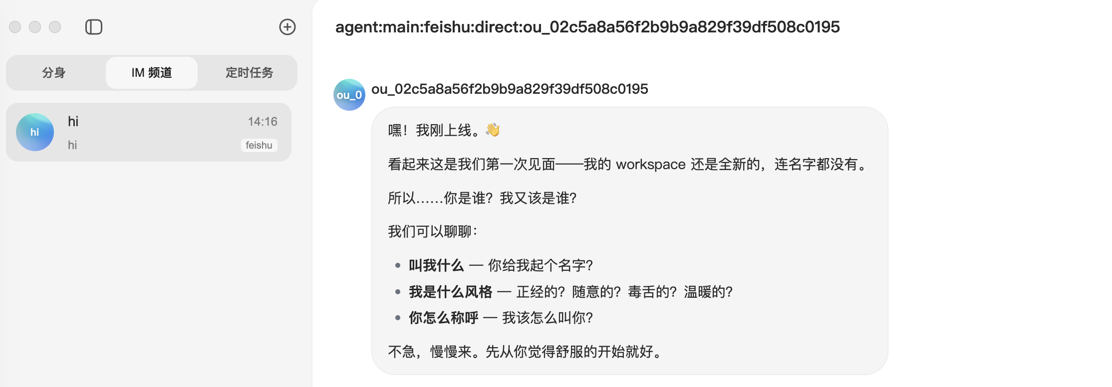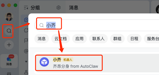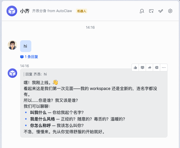 可以看到,飞书里的消息,也自动同步到 AutoClaw 了,后续可以直接在这个里面和他对话了。