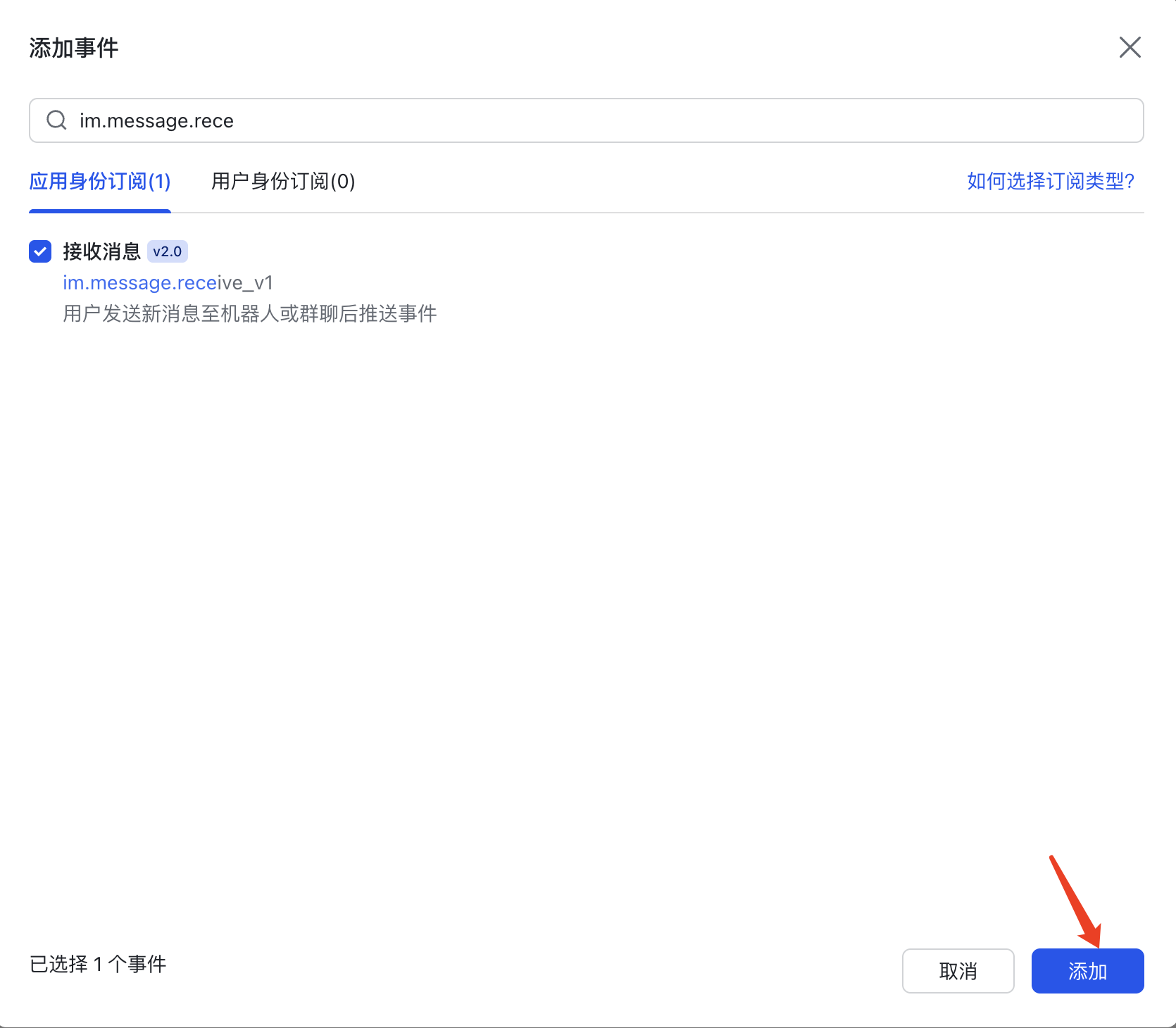 - 再次点击,并点击【添加事件】,搜索选择 im.message.cereive_v1,然后点击添加