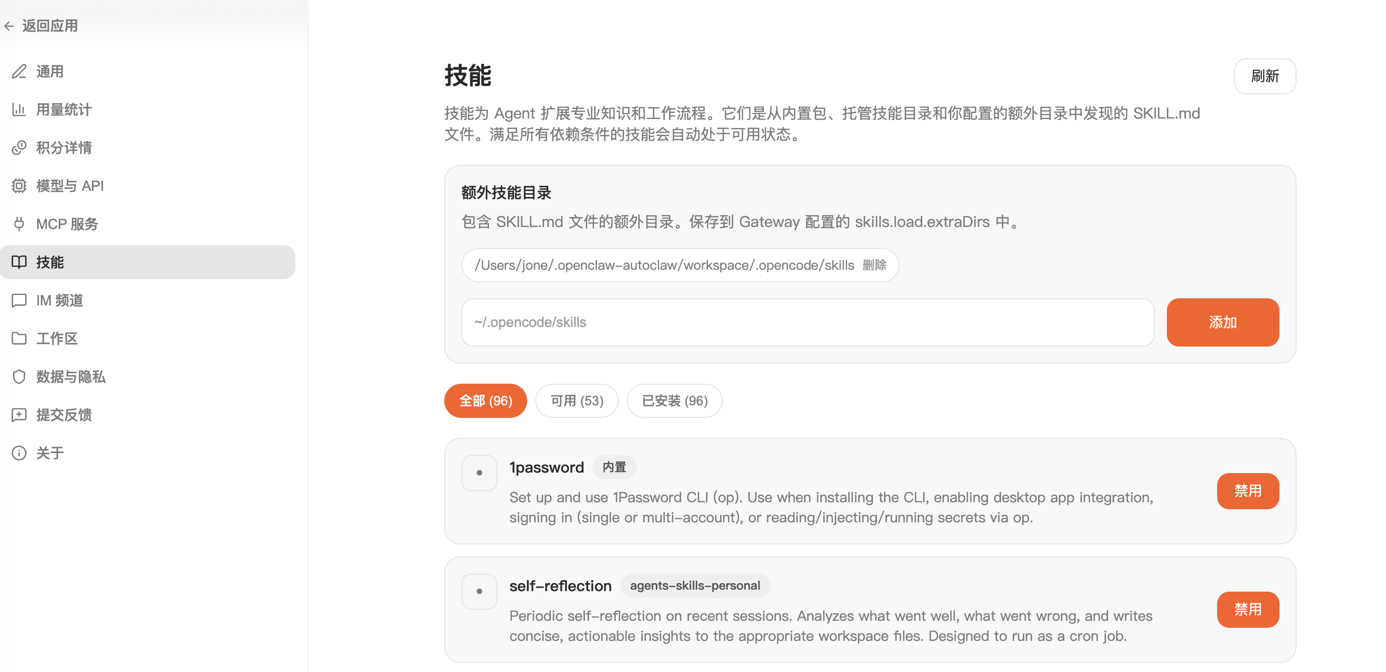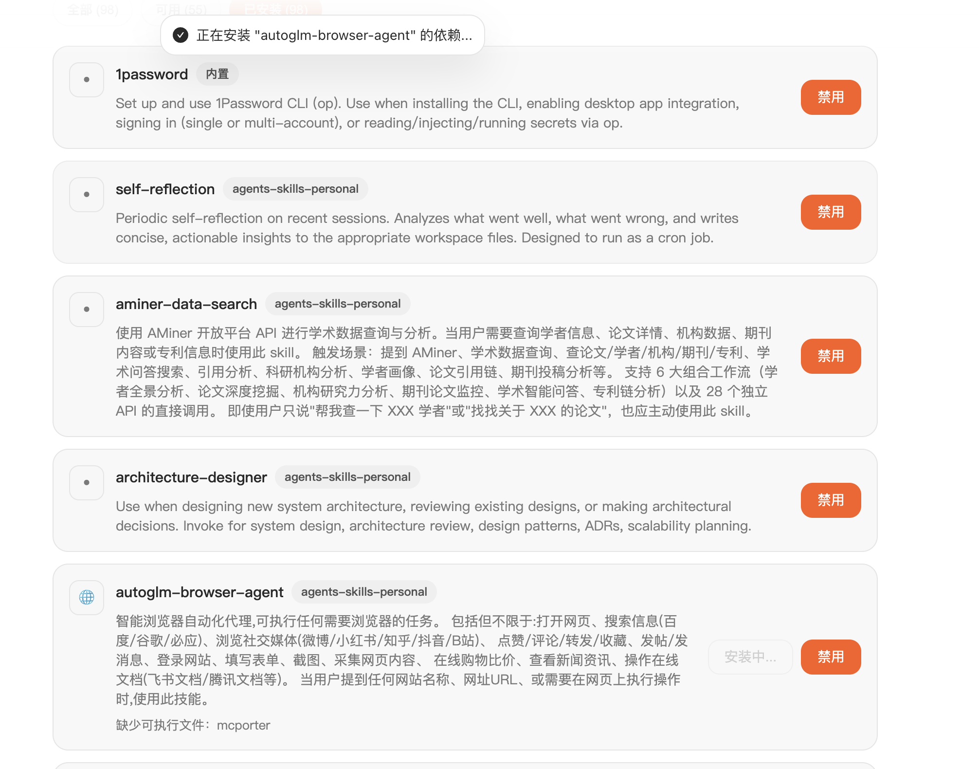 AutoClaw 默认安装了 98 个技能,其中 55 个技能是默认可用的,不可用的需要自己点击添加