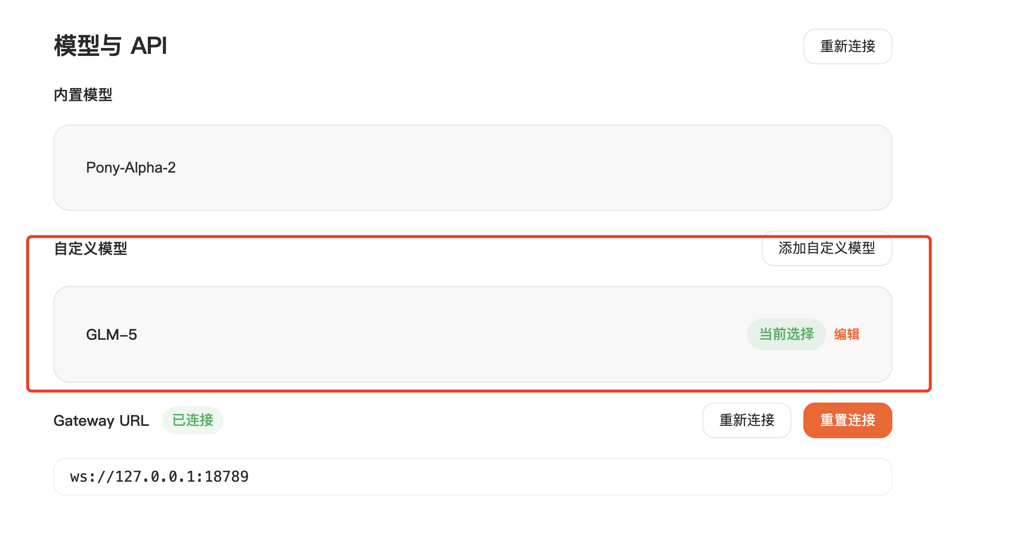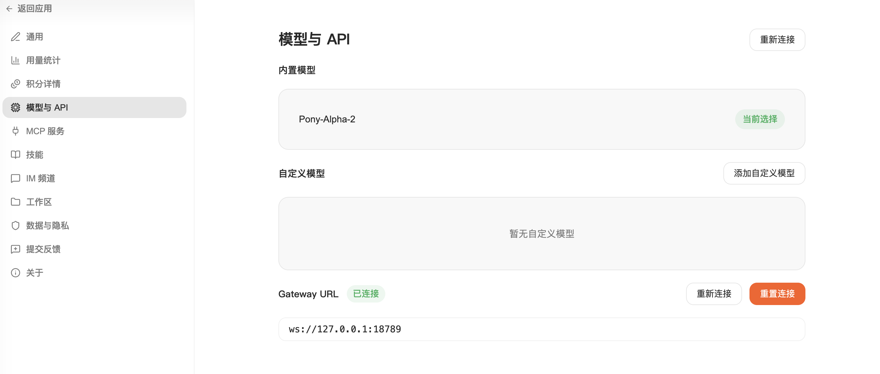 默认内置的模型是 Pony-Alpha-2,可以自定义API,放到实战部分讲解