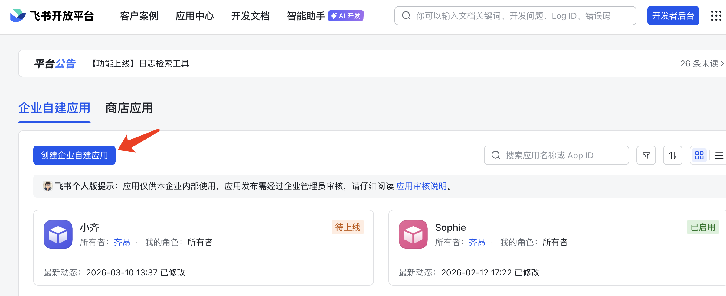- 打开飞书开发者平台: https://open.feishu.cn/app
