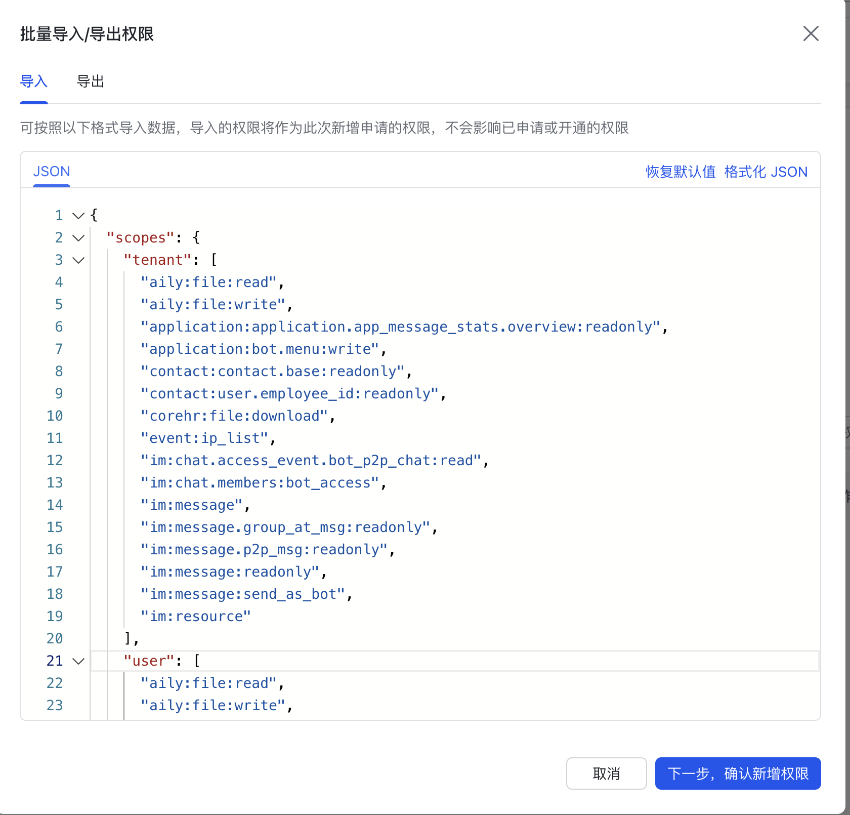 "tenant": [ "aily:file:read", "aily:file:write", "application:application.app_message_stats.overview:readonly", "application:bot.menu:write", "contact:contact.base:readonly", "contact:user.employee_id:readonly", "corehr:file:download", "event:ip_list", "im:chat.access_event.bot_p2p_chat:read", "im:chat.members:bot_access", "im:message", "im:message.group_at_msg:readonly", "im:message.p2p_msg:readonly", "im:message:readonly", "im:message:send_as_bot", "im:resource" ], "user": [ "aily:file:read", "aily:file:write", "im:chat.access_event.bot_p2p_chat:read", "im:message" ]