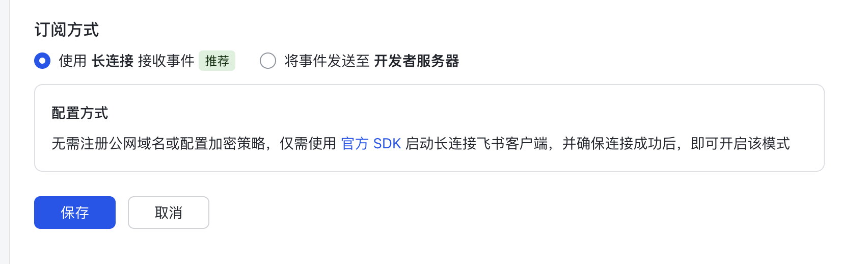 - 选择推荐的长链接模式,点击保存