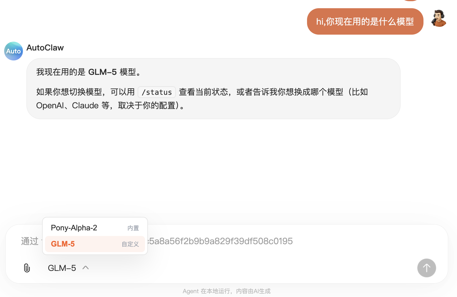 可以看到,现在多出了一个 GLM-5 的模型,并且对话回复也已经使用了这个模型