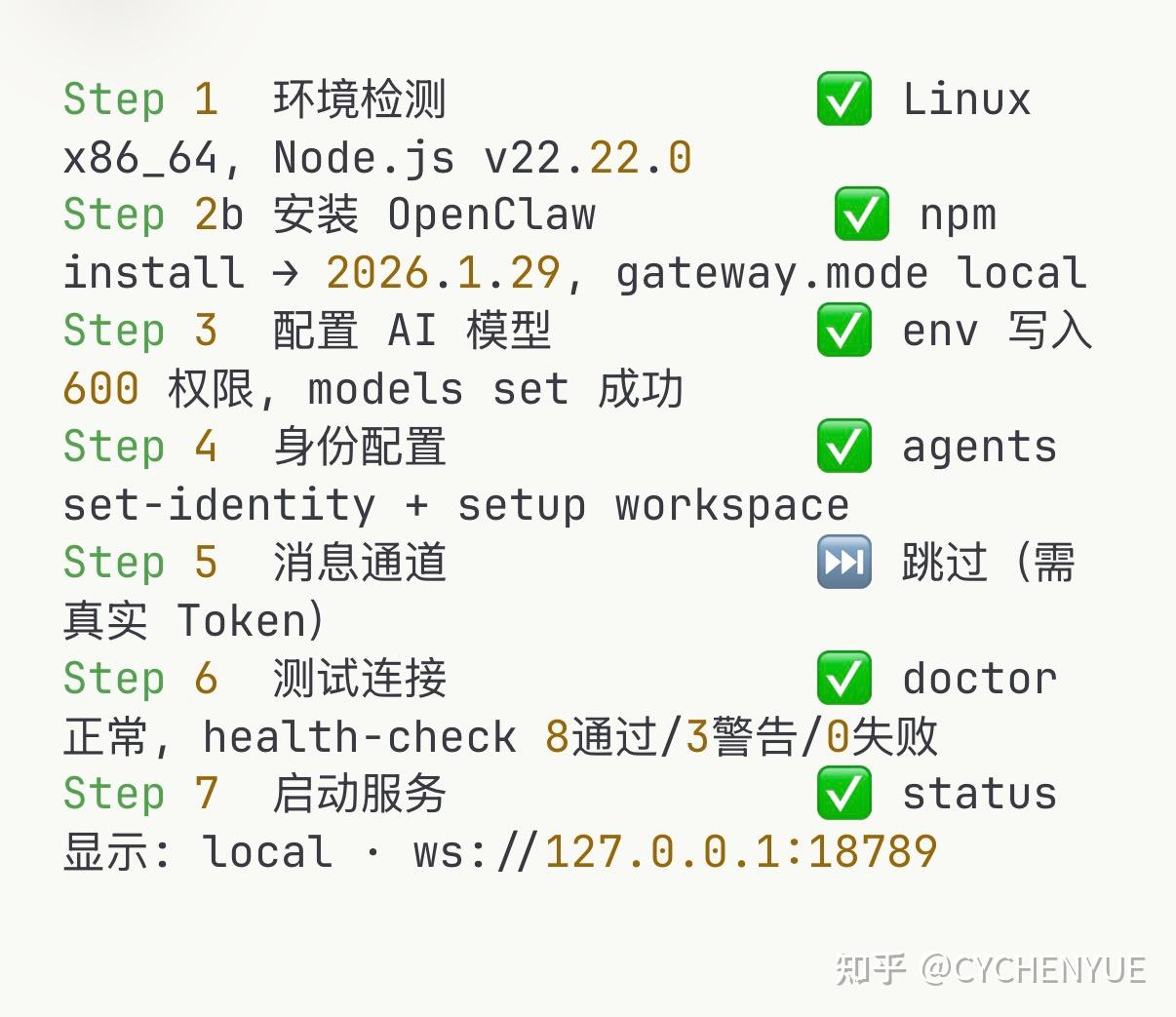 装 Node.js、npm 全局安装、写环境变量、配 API Key、设模型、接通道、起服务……