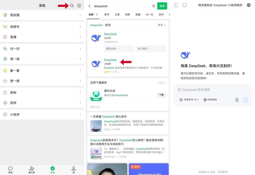 手机使用:下载DeepSeek的软件,就和下载微信一样,可以去手机里面的应用市场搜索DeepSeek进行下载。当然也可以在微信小程序内使用,具体方法:打开微信 → 点击搜索,然后搜索输入deepseek,点开小程序不用下载就能免费用。