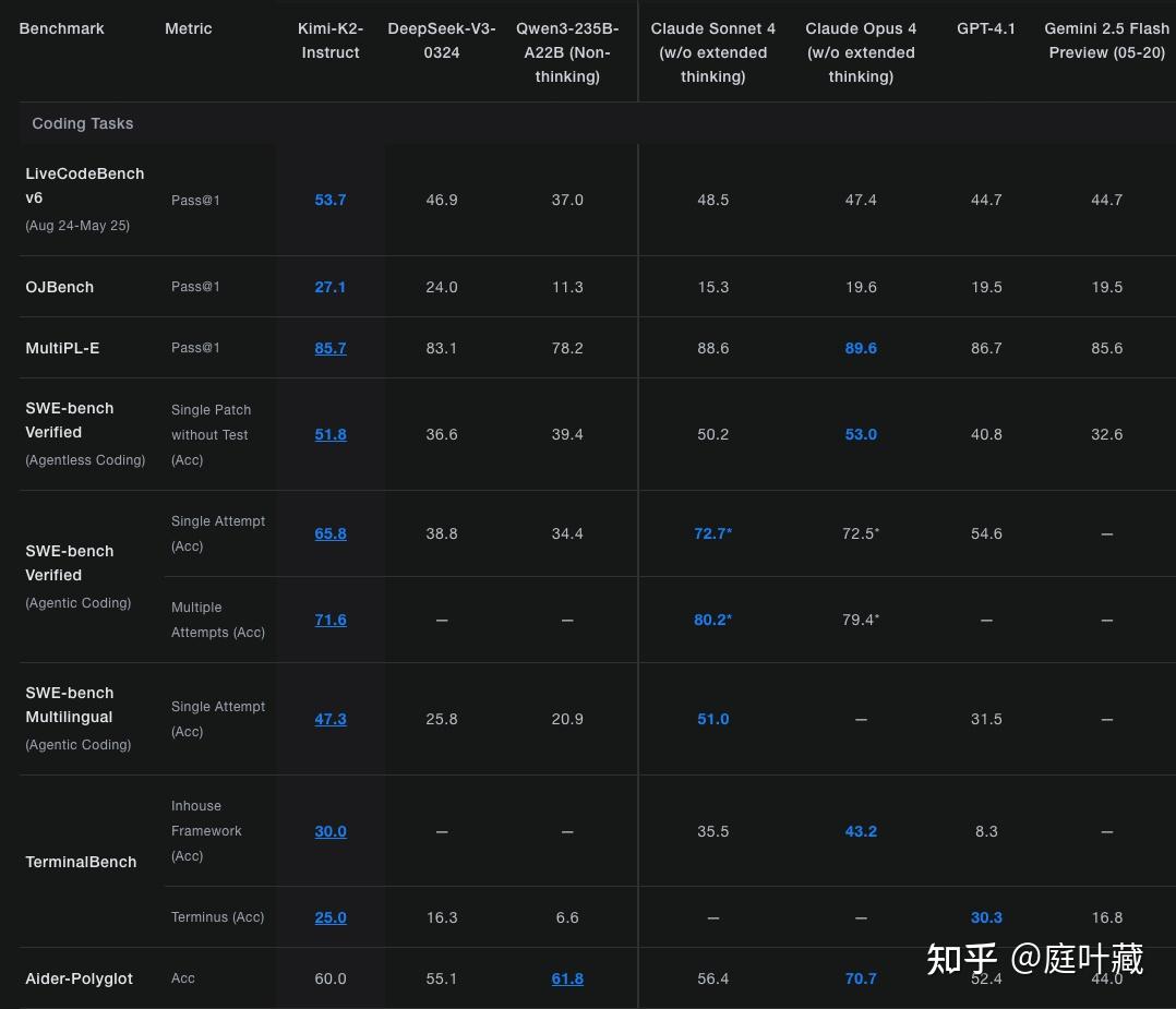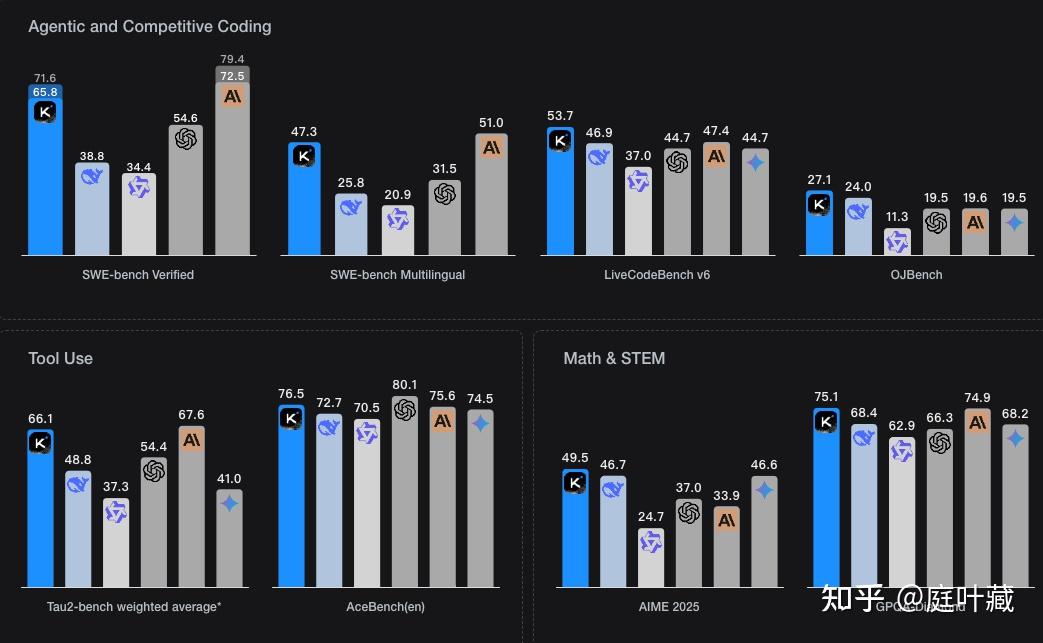 kimi k2在数学、编程和工具使用等领域内,性能优异,超越Deepseek、Qwen3等开源模型,在某些任务上性能接近Claude 4,GPT4等闭源大模型。