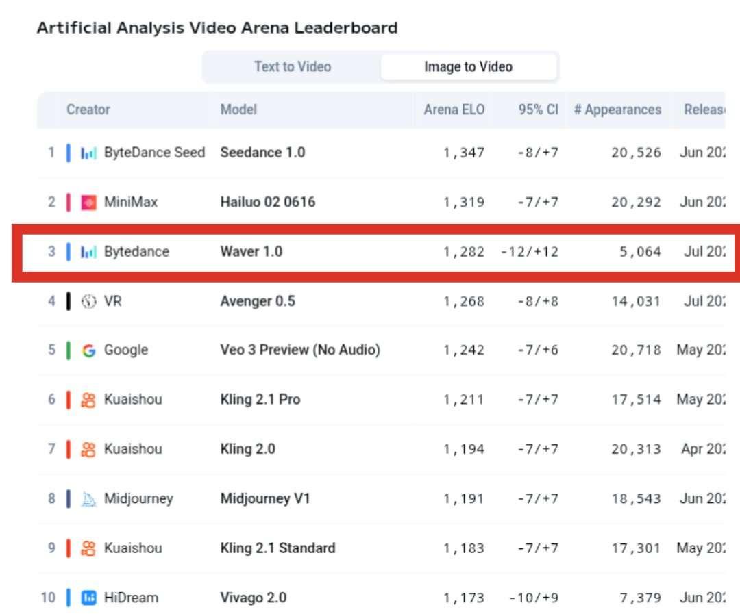 一个名为“Waver 1.0”的神秘新视频模型已出现在Video Arena排行榜上。该模型来自字节跳动(ByteDance),并在榜单上直接进入了第三名的位置。