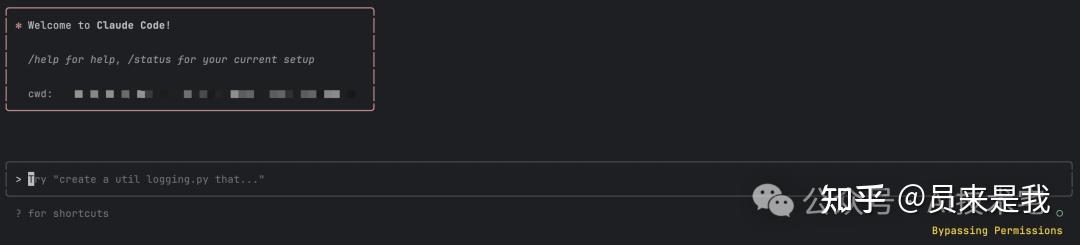 你需要点确认(Yes)才能开启 Bypassing Permissions 模式,开启此模式后,终端下面会出现黄色的 Bypassing Permissions 模式提示: