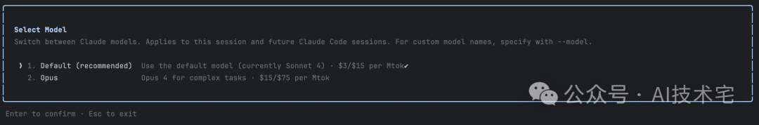 Claude Code 目前支持 Claude Opus 与 Claude Sonnet 4 两个模型的灵活切换,使用 /model 命令进行切换: