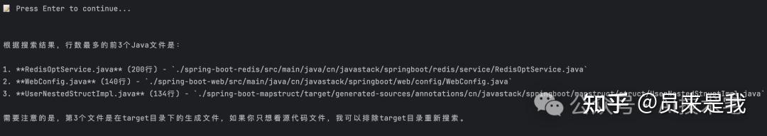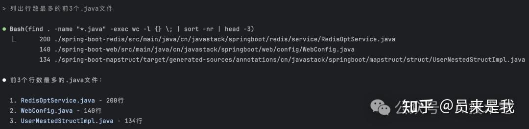 claude -p “列出行数最多的前3个.java文件”