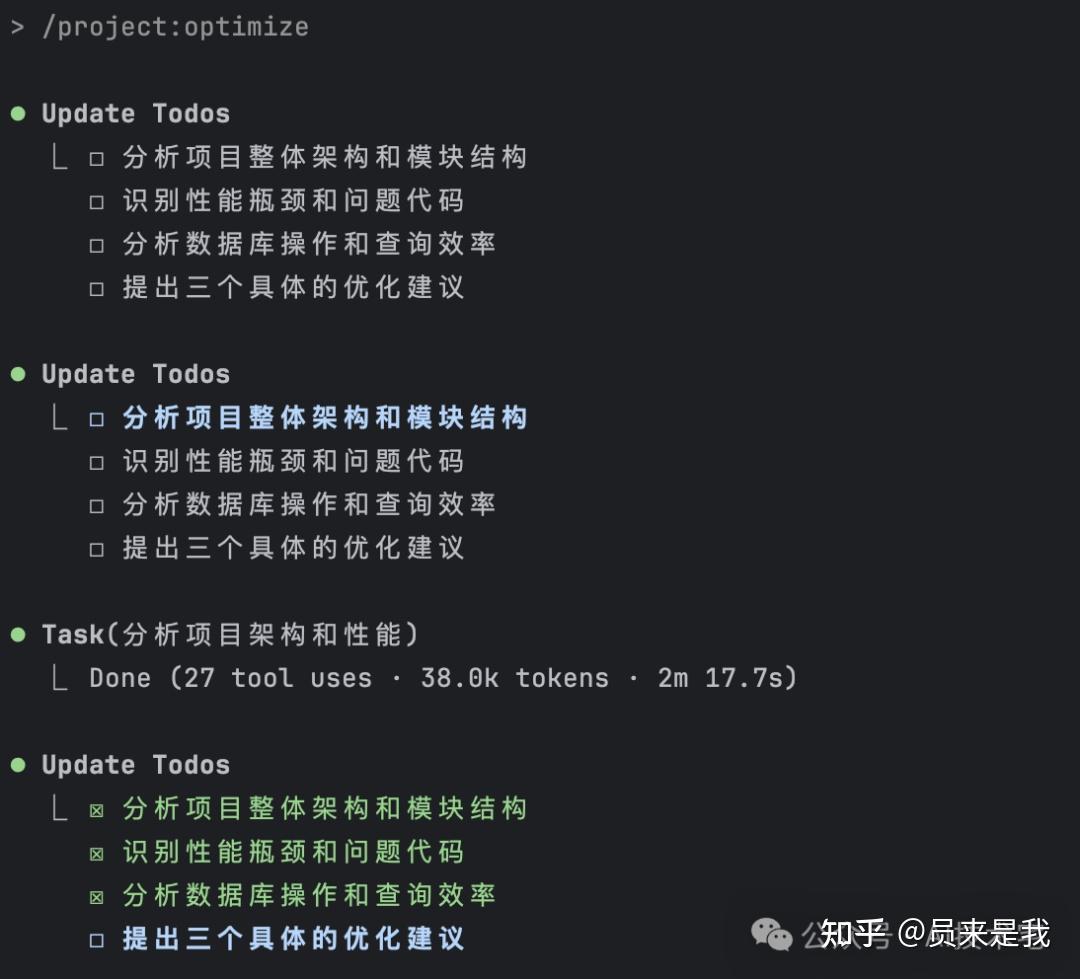 没想到它还自己把任务细化了,从分析项目整体架构、性能瓶颈、数据库操作,然后再提出优化建议。