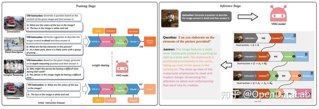 ● 无需额外表述:VIGC能够针对没见过的图像内容依然生成高质量的问答数据,得益于VIGC模型能够通过视觉模型提取到图像的视觉信息,并依赖于后续的语言模型自动生成答案。这里的关键点在于:视觉模型和大语言模型本身就看过海量的图文、纯文本数据,本身集成了大量的知识,VIGC更像是从这些大模型中蒸馏出跟图像相关的知识。