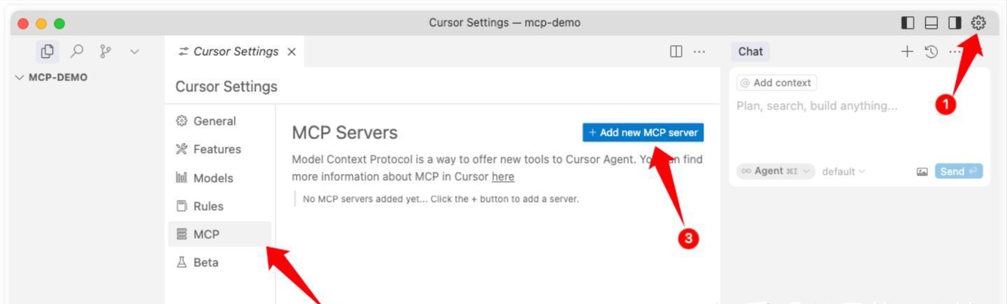 启动 Cursor IDE ,参照图片步骤进入 MCP 配置的位置