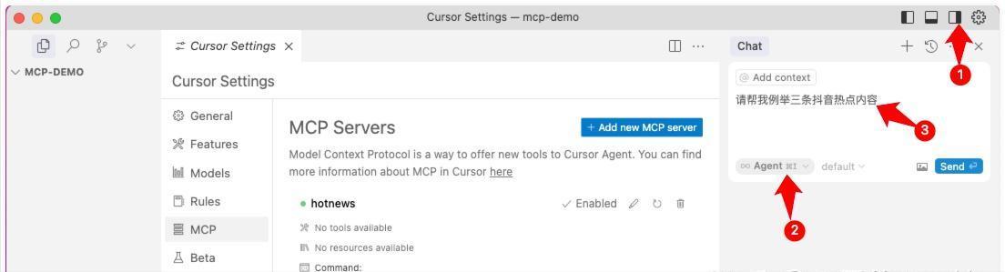 打卡 Cursor 的 Chat 对话框,选择Agent 模式,输入要求