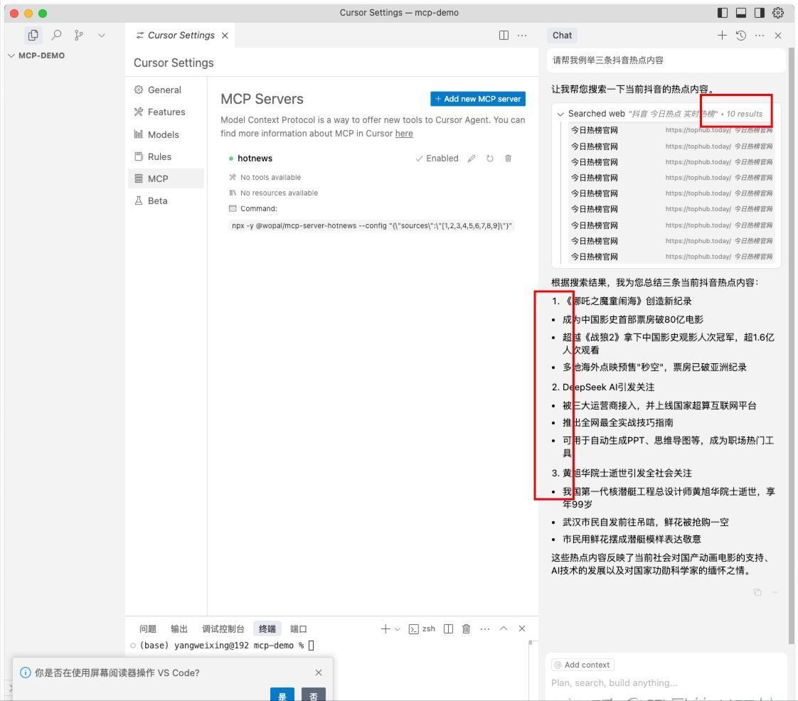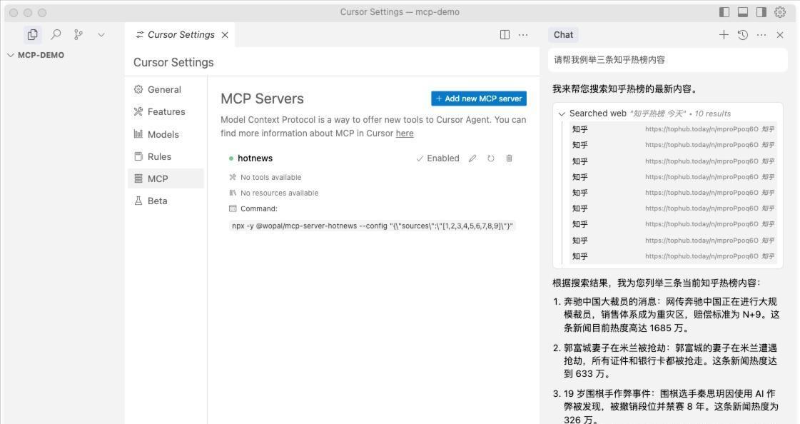 到这里,我们就使用 Cursor 配置了热榜的 mcp-server,如果我们想开发一个类似热榜的程序,那么再也不需要逐个对接,护着写爬虫。可以直接使用开源 mcp-server,借助 AI 来帮助我们完成。