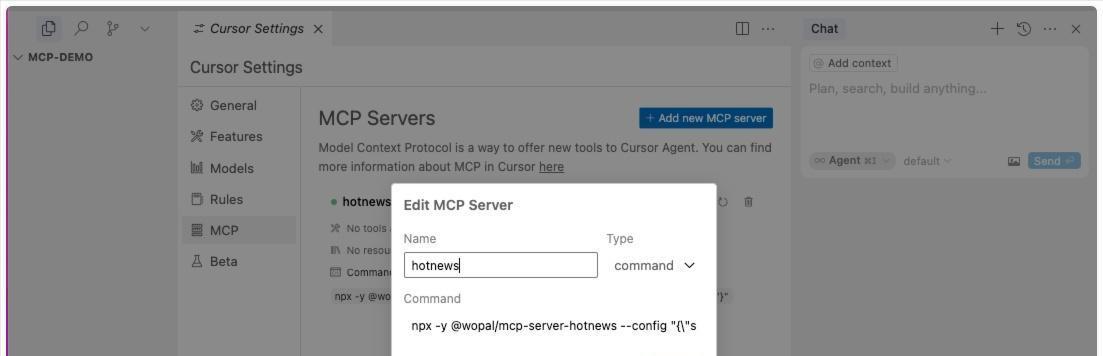 转换成 Cursor 识别的。 npx -y @wopal/mcp-server-hotnews –config “{"sources":"[1,2,3,4,5,6,7,8,9]"}”