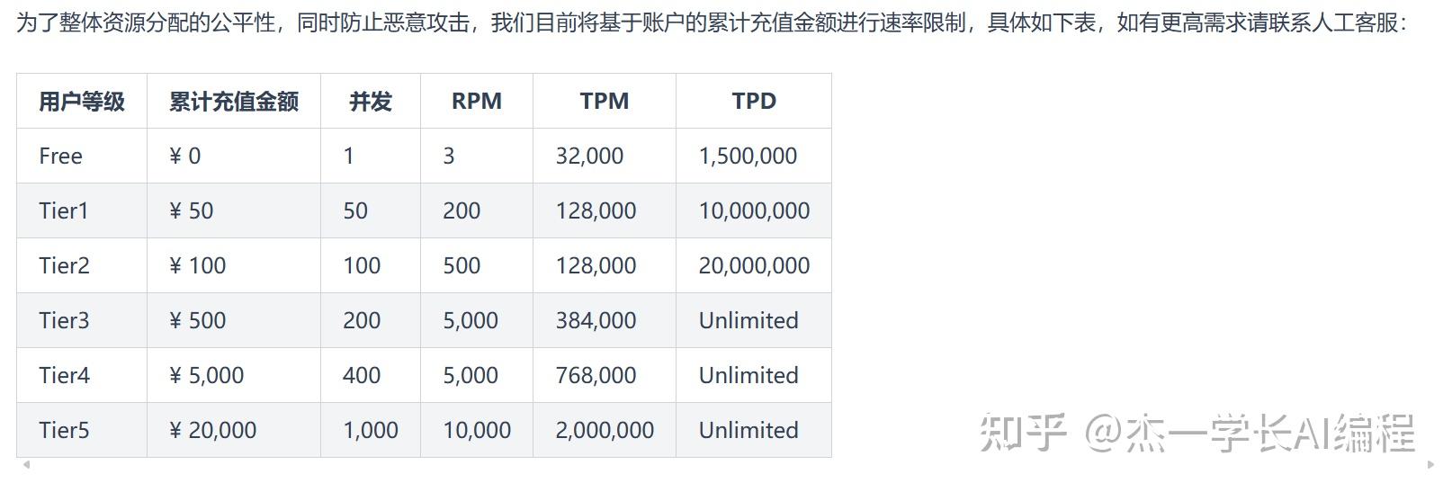 虽然注册后会赠送15¥的额度,但免费账号的请求速率限制比较紧。RPM 只有 3,TPM 为 32000,意味着每分钟最多只能发 3 次请求,总 Token 数不能超过 32000。