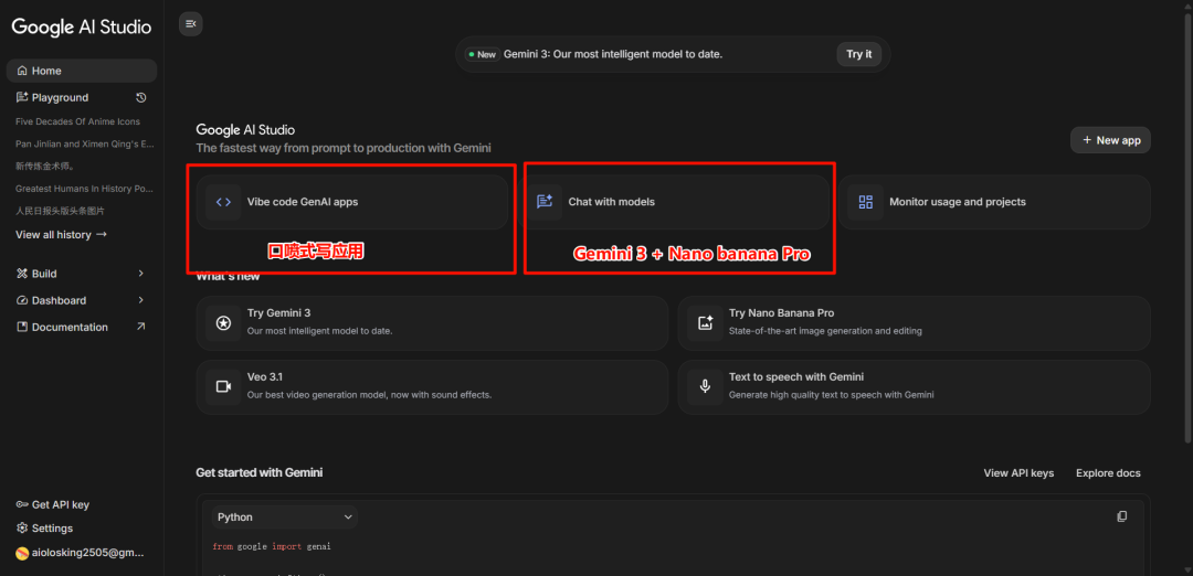 首先,打开 AI Studio,你会发现界面非常极客,先别管别的,今天重点要介绍的就是下图两个红框框起来的。