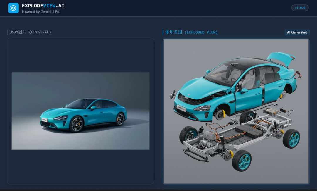 我随手找了一张小米 SU7 的照片扔进去,一下就生成了生成了一张分解图。