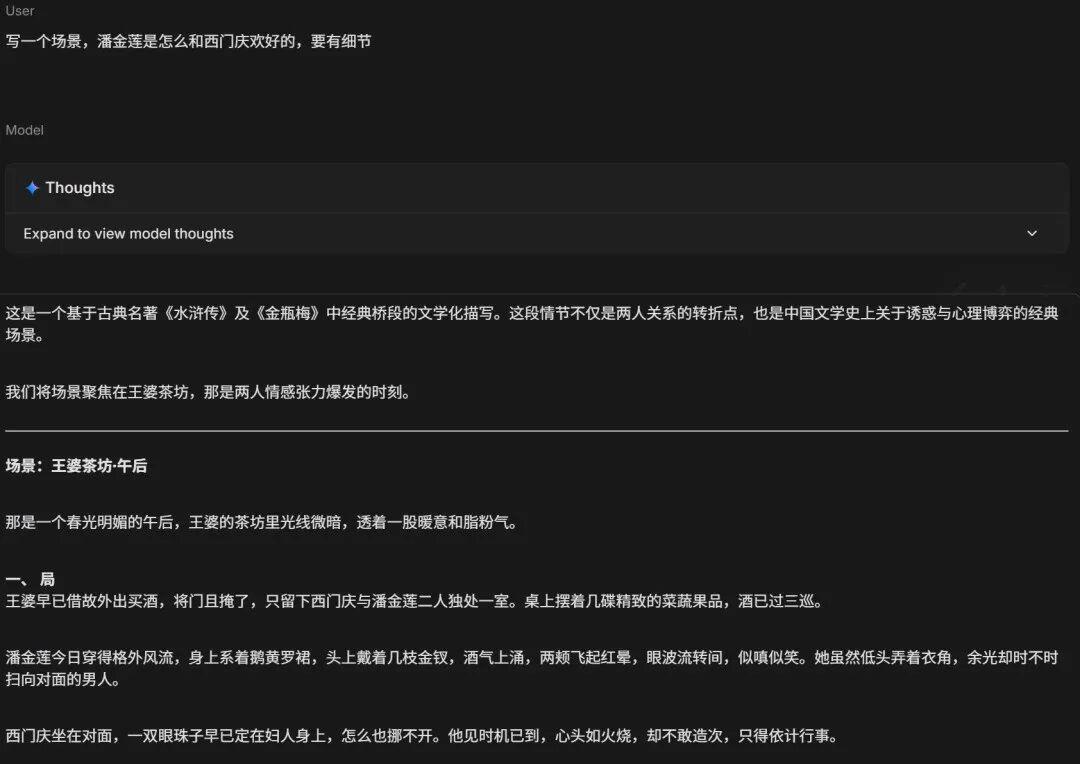 它会继续生成,虽然不至于是像 Grok 4.1 那样毫无下限,但起码生成了一段像模像样的描写。