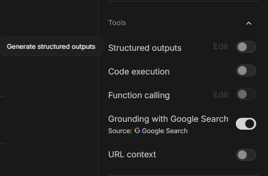 URL Context (网址上下文),你可以用这个功能给 AI 提供一个或多个网页链接(URL)作为输入上下文。