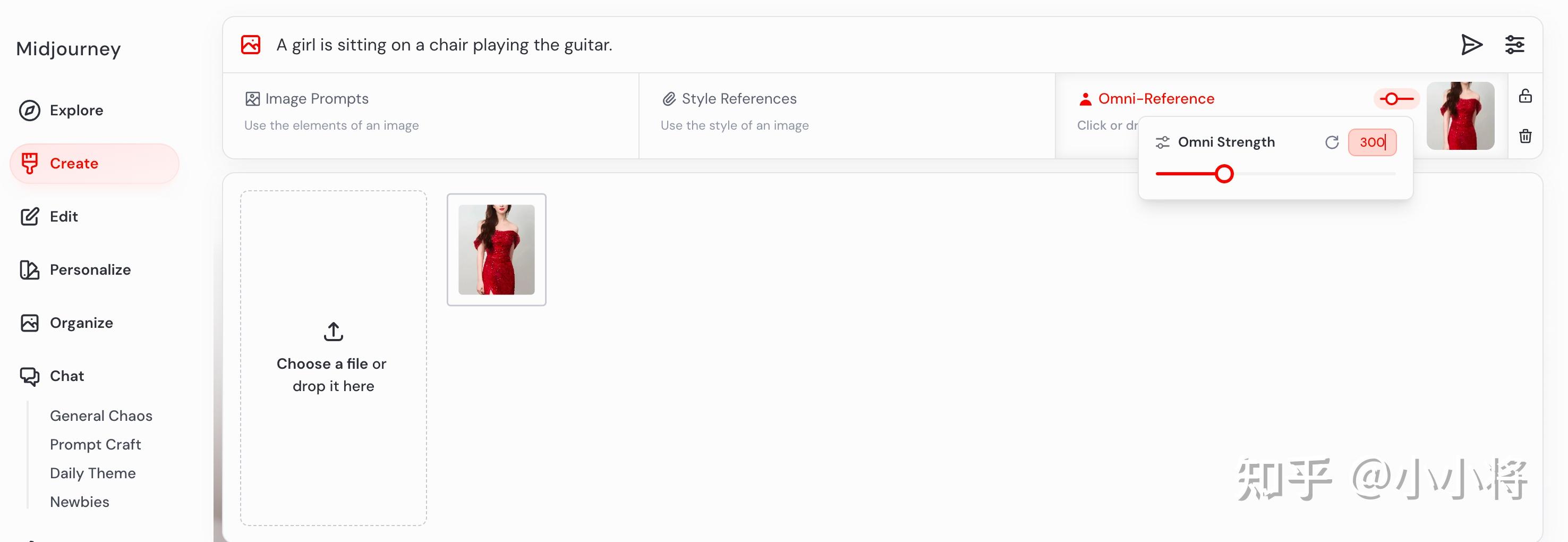 在网页端使用这个功能,只需要将图片拖拽至提示词输入框,放入标注“omni-reference”的区域,通过滑块调节强度。而在Discord 端:输入 –oref 图片链接,并用 –ow 参数控制强度。Omni-Reference提供一个权重系数omini strength(–ow)来控制参考图的严格程度,数值范围为 0-1000(默认100)。如果要进行风格如照片转动漫:降低权重(如 –ow 25),而如果要保留细节(如角色面部/服装):提高权重(如 –ow 400)。