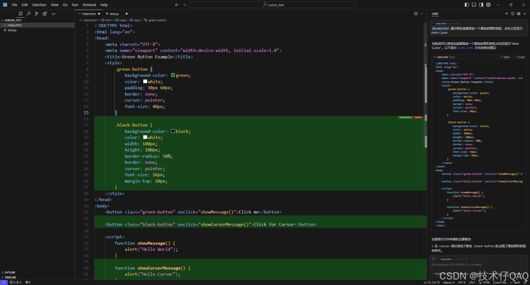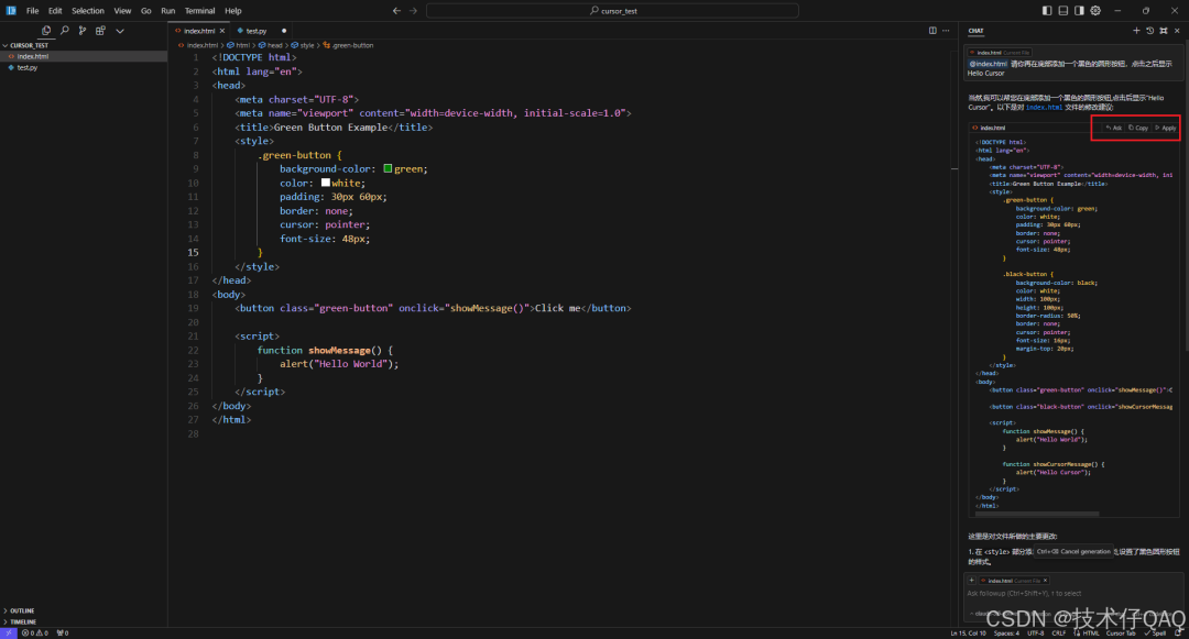 直接提出要求,如果是编辑代码则可以直接点击Apply,也会和Ctrl+K一样,直接覆盖到编译器中。
