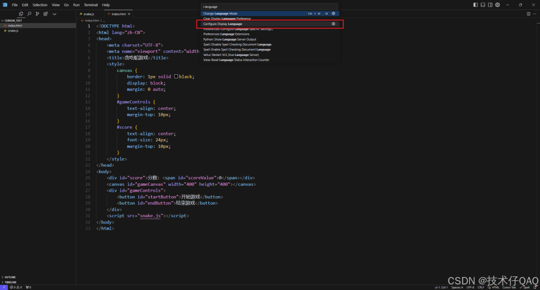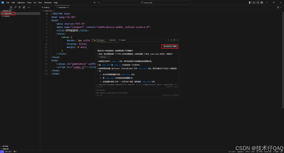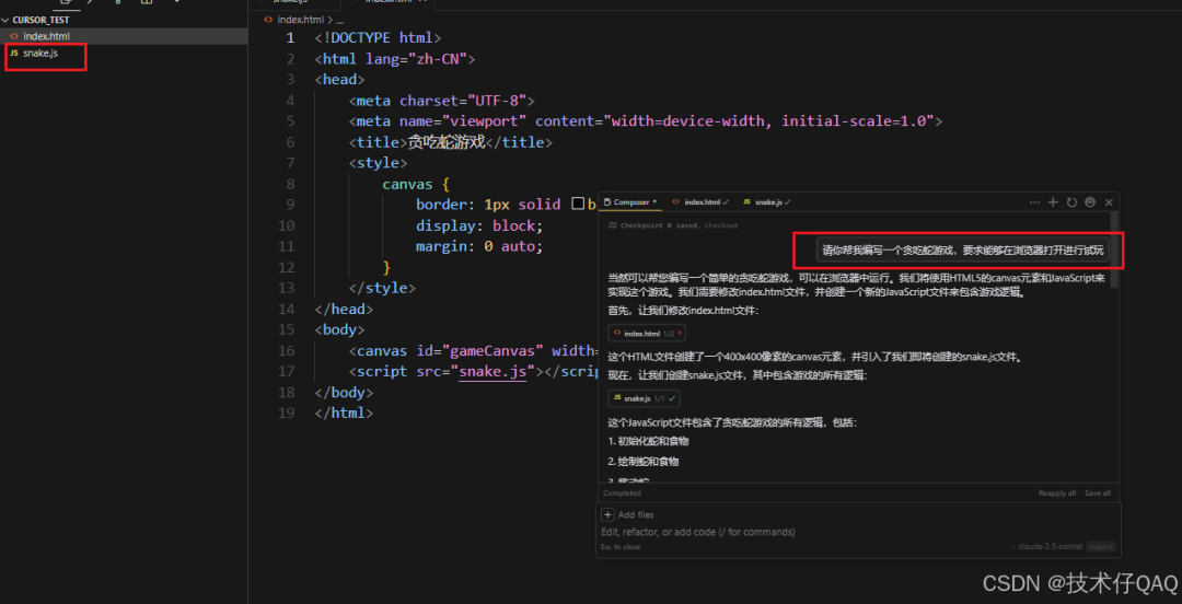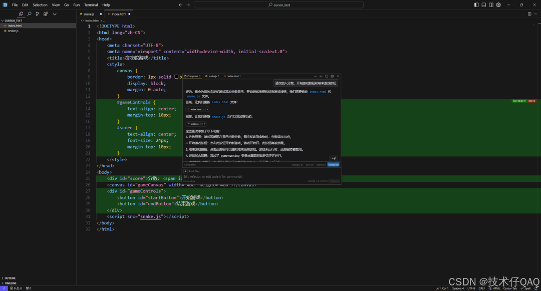 让他写一个贪吃蛇游戏,点击Accept all直接应用。