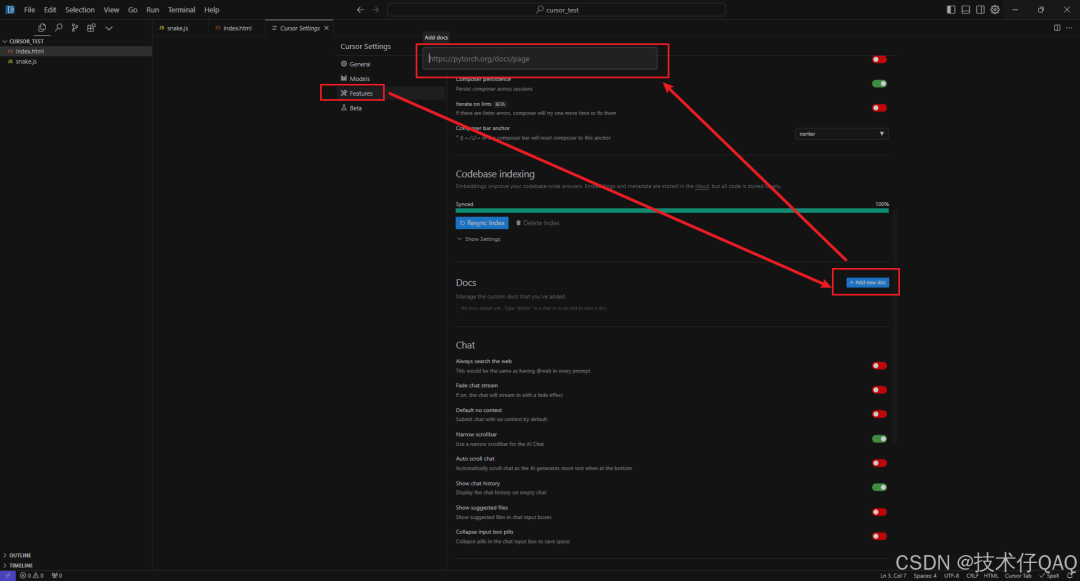 cursor也提供了为外部文档建立知识库进行问答的功能,可以在设置中加入文档,例如加入开发文档作为Cursor的知识库来更好的辅助编程。